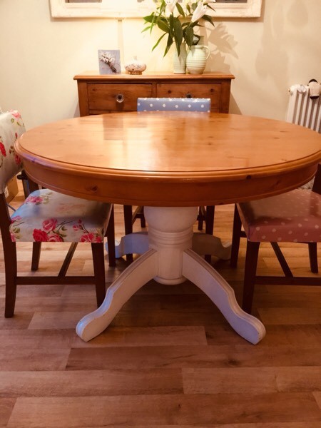 Beautiful farm house pine kitchen table, sanded wooden top and annie sloan old white painted legs this beautiful kitchen table is fabulous good quality piece of furniture with character.